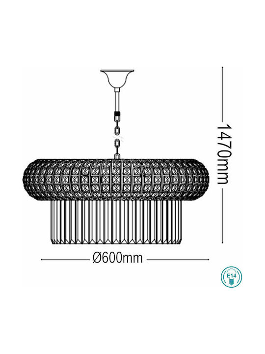 Με διάμετρο 60cm και σχεδίαση που τραβά τα βλέμματα, ο συγκεκριμένος κρεμαστός πολυέλαιος ταιριάζει ιδανικά σε σαλόνια, τραπεζαρίες, χώρους υποδοχής, boutique ξενοδοχεία ή κάθε εσωτερικό χώρο όπου απαιτείται έντονη διακοσμητική παρουσία. Οι 12 υποδοχές λαμπτήρων E14 προσφέρουν τη δυνατότητα για πλούσιο και ομοιόμορφο φωτισμό, ενώ σας επιτρέπουν να επιλέξετε τους κατάλληλους λαμπτήρες ανάλογα με την επιθυμητή ατμόσφαιρα.
